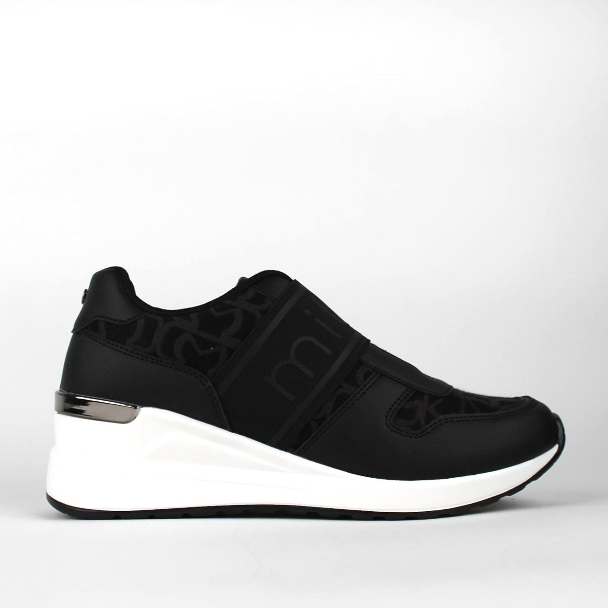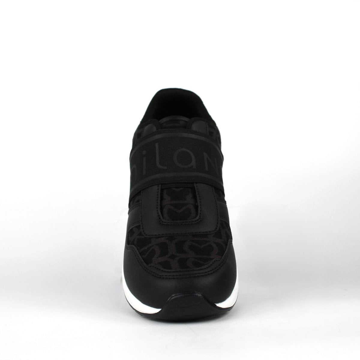 Women's wedge sneakers. The shoes have a mid-heighted white wedge sole that provides a significant lift. The upper is black with a subtle, all-over "M"pattern. A wide strap with the brand 'Milano" statement printed on it crosses the midfoot. The heel is accented with a metallic, silver-toned detail and perfect for a casual, yet refined, everyday style.