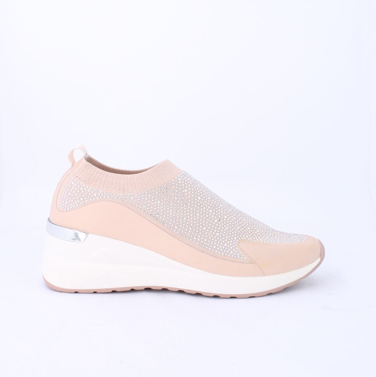 Sheina slip-on sneaker with a wedge sole. The upper is made from a stretchy, sock-like knit material, embellished with sparkling rhinestones, adding a touch of glamour. It has a pull-tab at the back for easy slip-on access. This sneaker combines fashion and functionality, making it suitable for both casual and semi-dressy occasions.