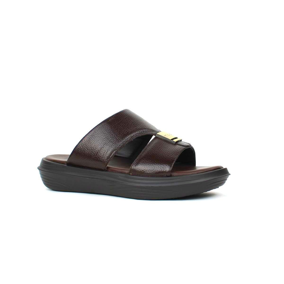 Step into refined tradition with our Hamish premium leather sandal, crafted for those who value both heritage and modern comfort. Featuring a rich brown tumbled leather upper and dual wide straps for a secure fit, this sandal blends classic design with contemporary elegance.A subtle gold accent in terms of a trim on the top strap adds a luxurious touch, while the cushioned footbed ensures all-day comfort. The durable black rubber sole offers reliable traction, making it ideal for both casual outings and traditional gatherings and it has a slight elevated outsole for extra height.