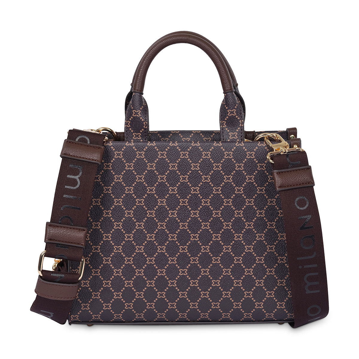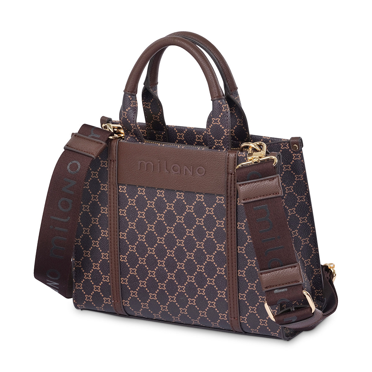 Brown monogram tote with contrasting panelling and a stylish tonal Milano logo. Featuring main zip closure and internal phone pockets for added security, as well as a premium Milano branded and adjustable webbing strap