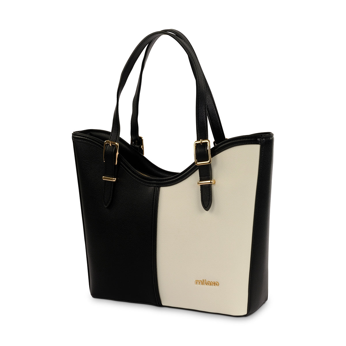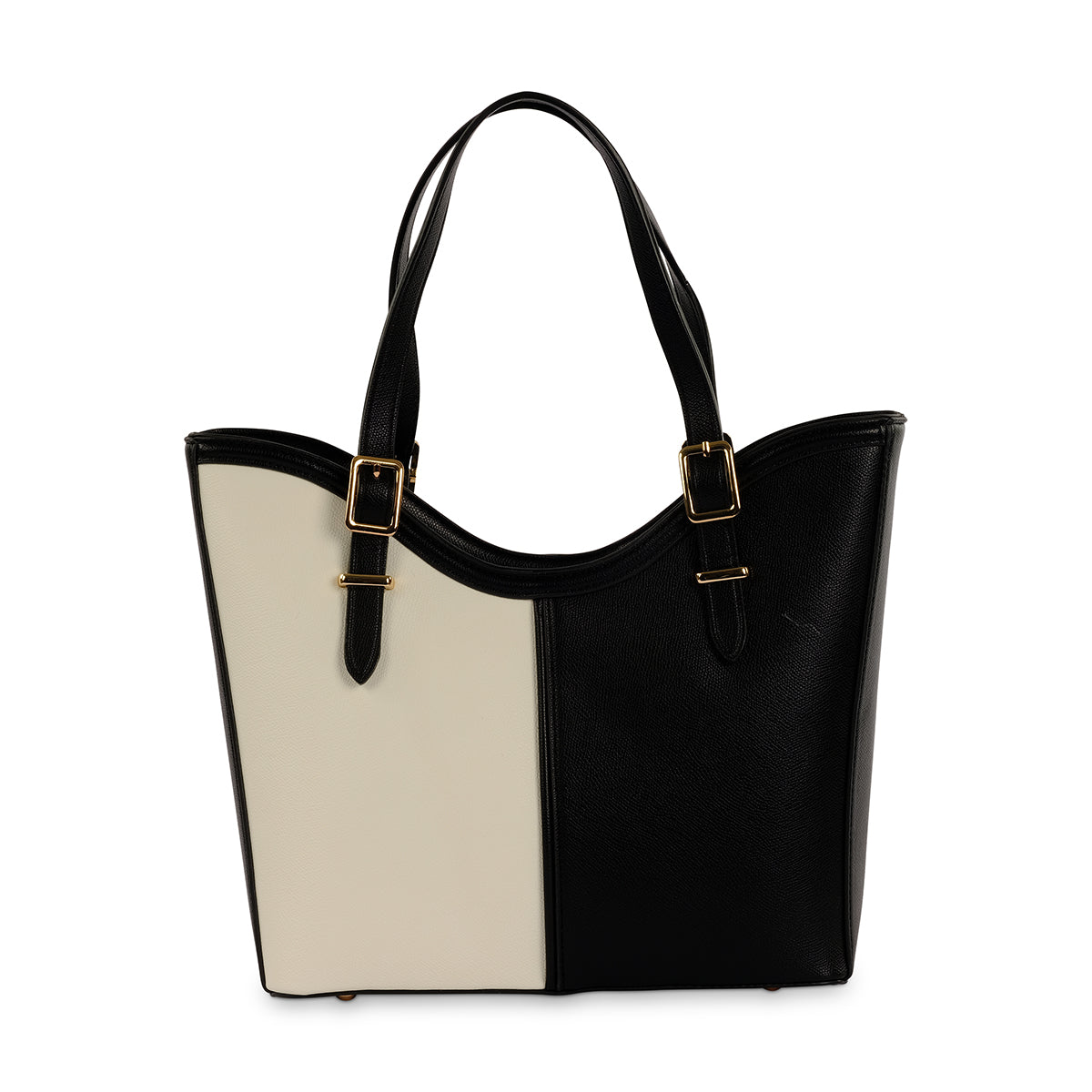 A contemporary monochrome tote bag, featuring two toned colour blocking, adjustable straps and premium gold hardware. Featuring a long adjustable strap
