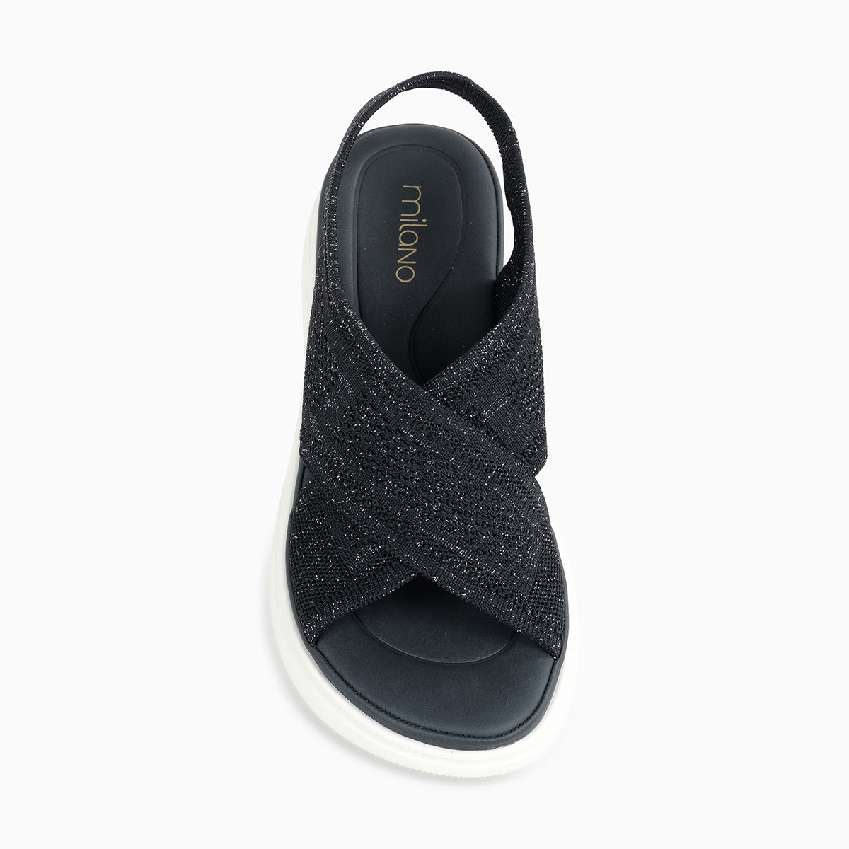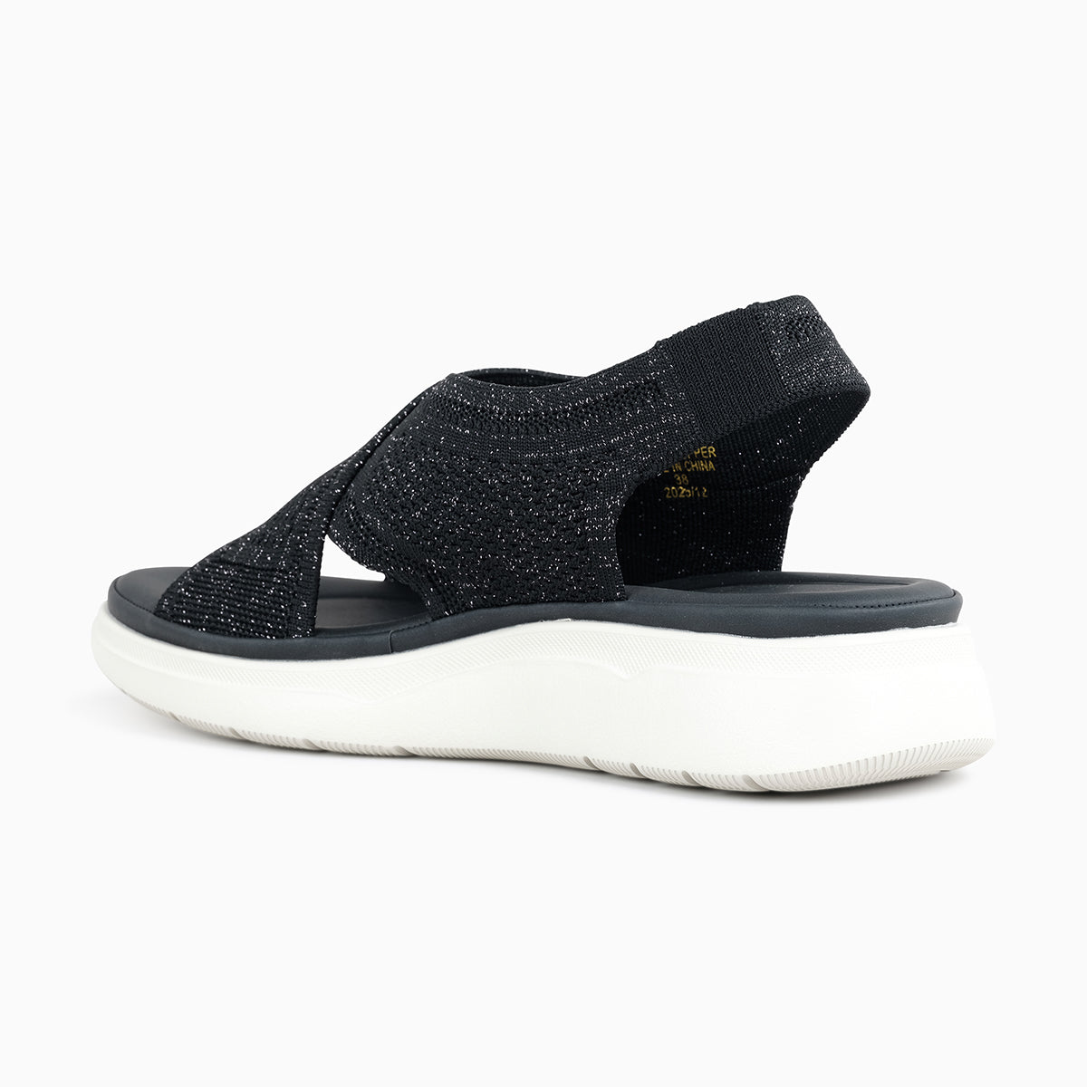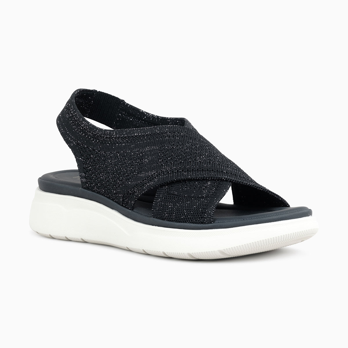 Comfortable black sandal featuring a soft knitted upper with crisscross straps and an elastic back strap for a secure fit. Designed with a cushioned footbed and lightweight sole for all-day comfort—perfect for casual everyday wear.
