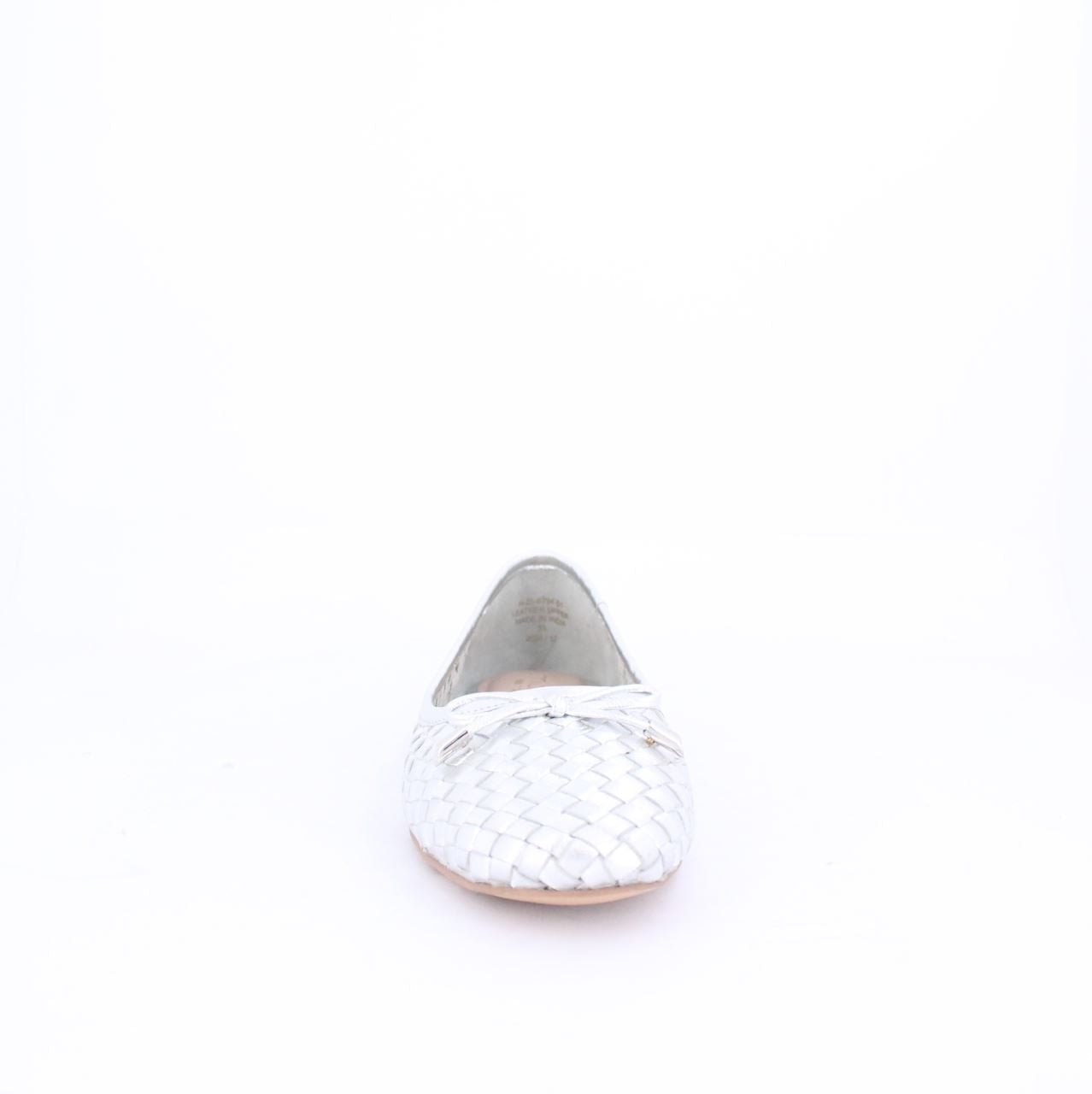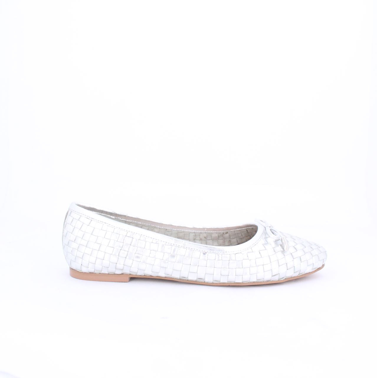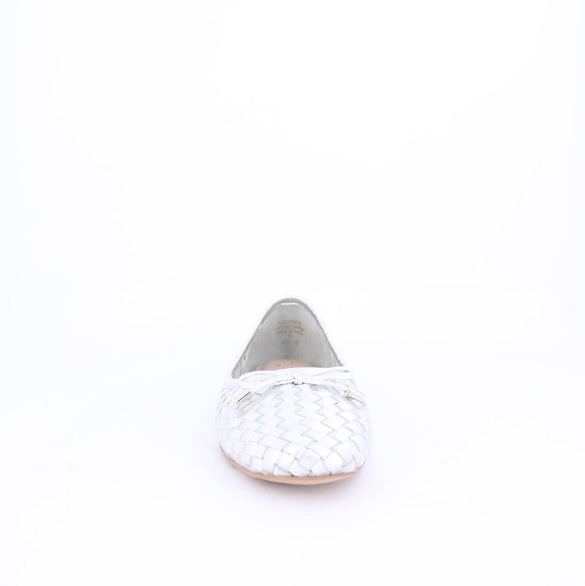 A stylish metallic ballet flat with a woven leather uppper, giving it a unique and elegant look. The shoe has a almond toe shape and is adorned with a delicate bow at the front, accented with gold-tone metal tips.