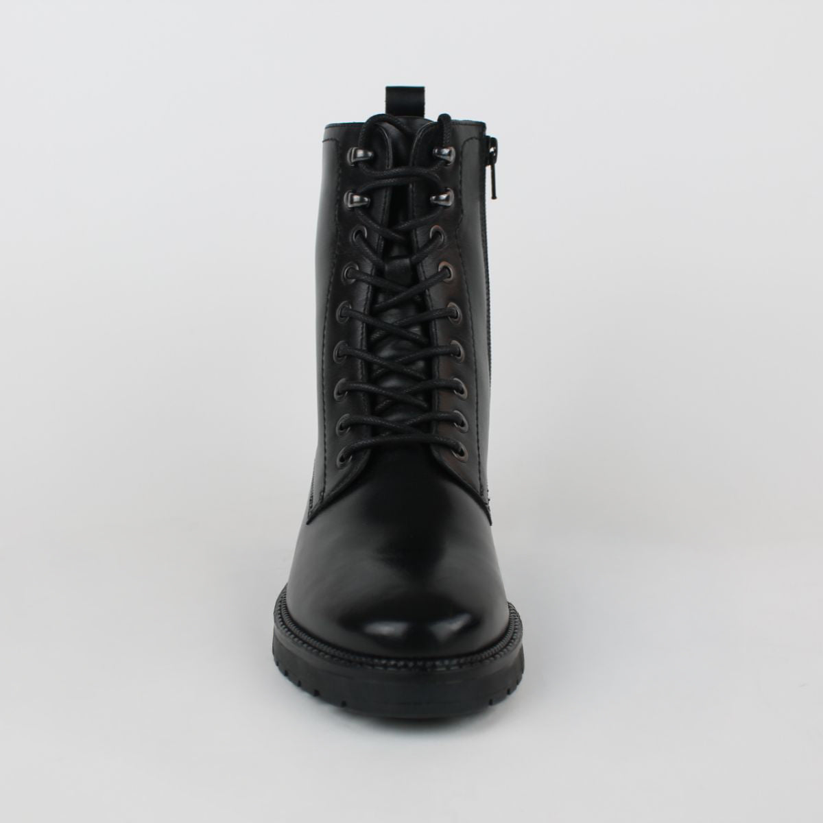 Classic Leather Biker Boot. Crafted from a premium leather upper, this boot combines rugged durability with a sleek, polished look. The lace-up front and sturdy lug sole give it an authentic biker feel, while the versatile black design makes it an essential piece for year-round styling.