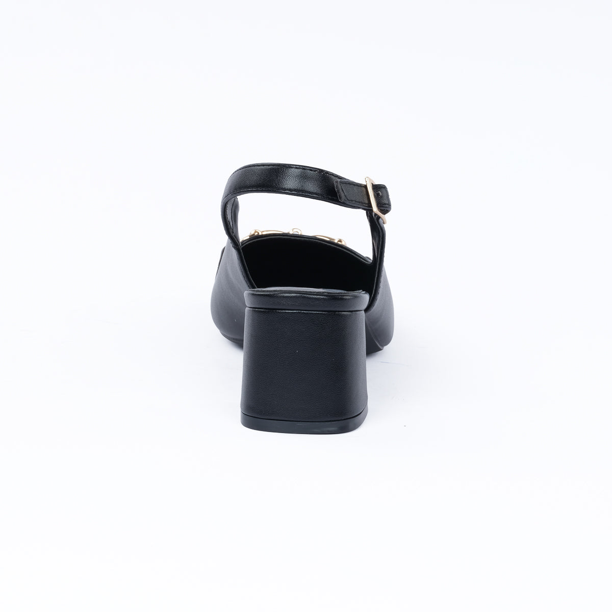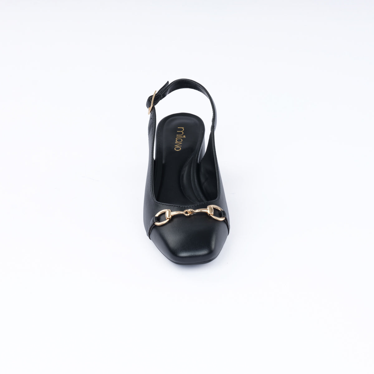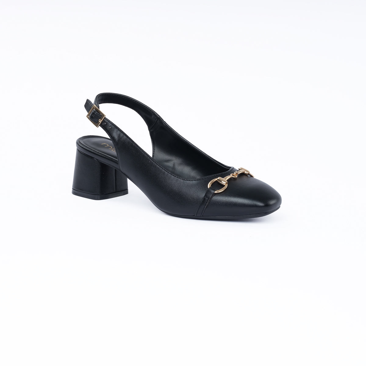 A modern slingback block heel with a rounded toe and a polished metal trim accent, offering a sophisticated look for both office and casual wear.