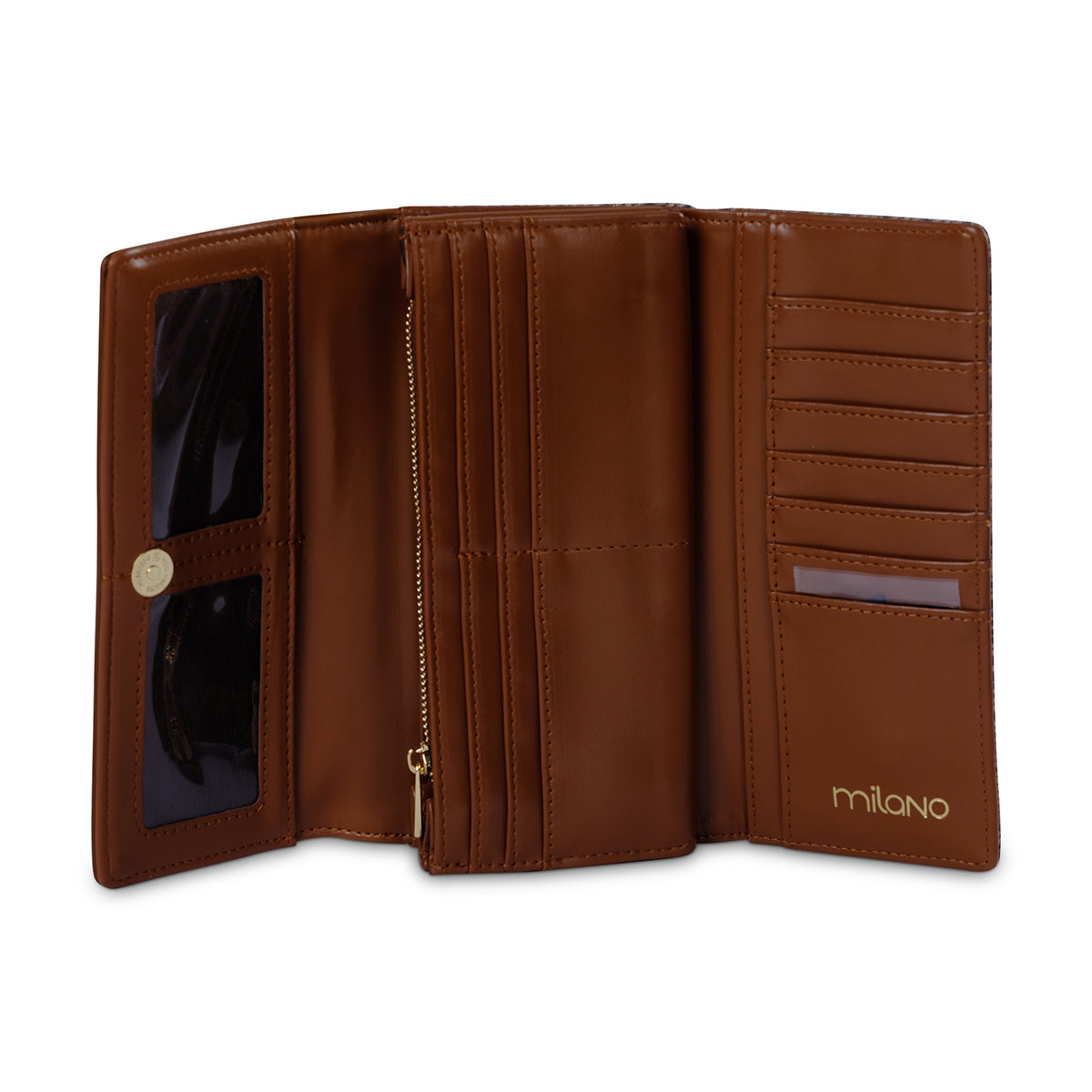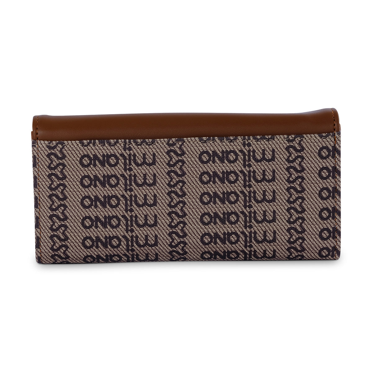 Complete your look with the 'Shakira' long wallet, an elegant accessory that combines style and functionality. This wallet features a sleek brown leatherette flap with a subtle gold logo, complementing the signature logo print on the bottom. It is a beautiful, cohesive piece that is part of the full Shakira collection